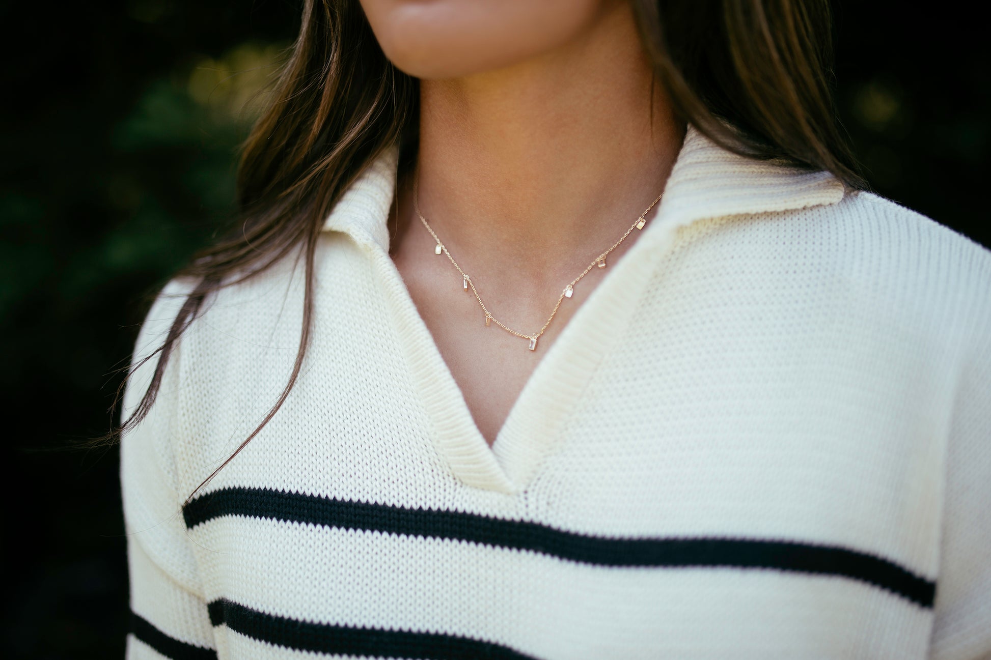 A delicate gold chain adorned with petite, gold, rectangles, and dangling emerald cut crystals – subtle shimmer with modern elegance.