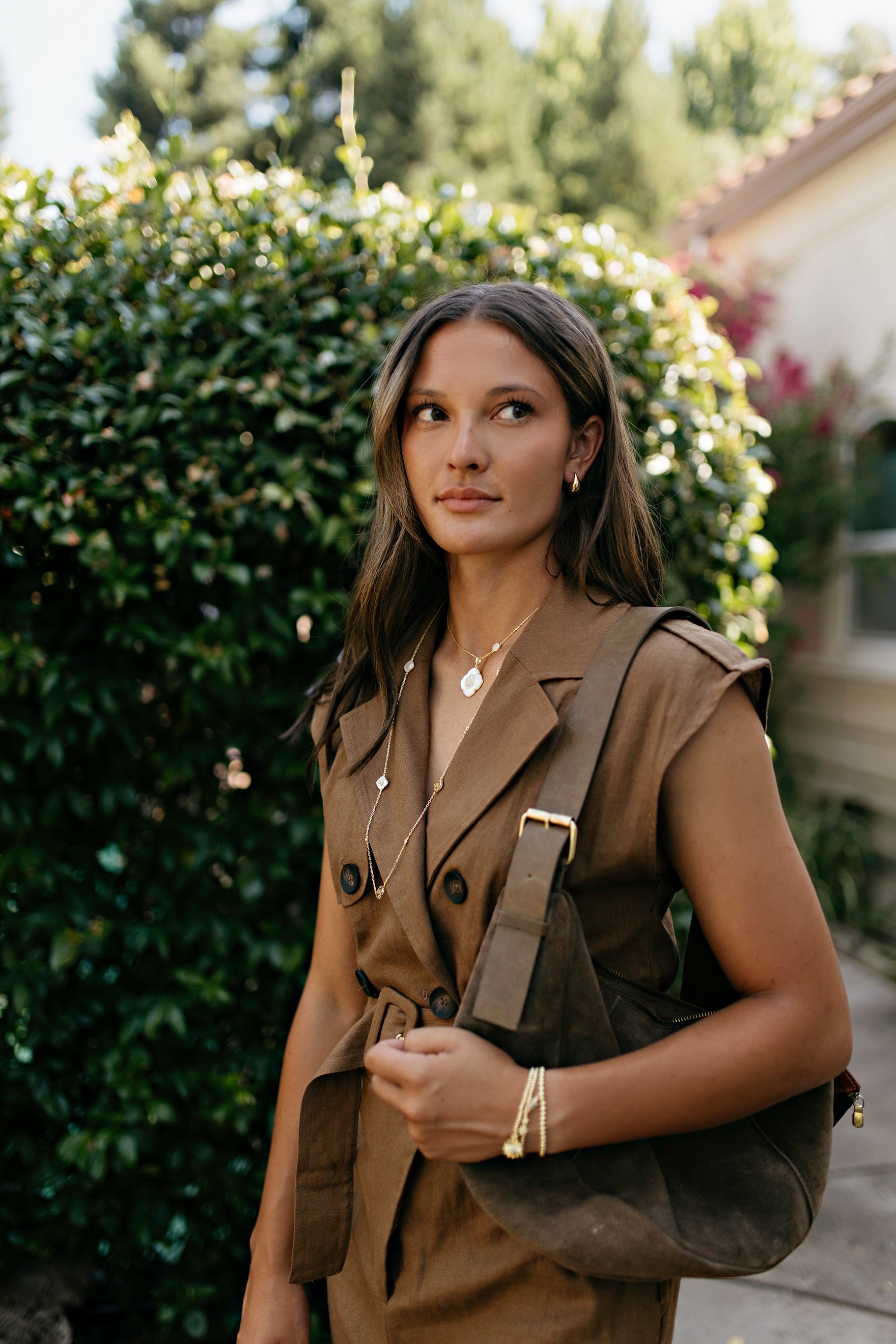 Timeless and refined, the Mayfair necklace features a luminous mother of pearl pendant with a pave crystal coin inlaid at its center. A second pave crystal coin along the chain as a touch of unexpected elegance. 18 karat gold plated for a classic finish, this piece embodies, quiet luxury with a hint of sparkle.